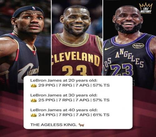 數(shù)據(jù)顯示,詹姆斯20-29歲時場均29分7籃板7助攻,真實命中率57%;30-39歲時場均25分7籃板7助攻,真實命中率仍保持57%;而40歲至今,他場均能得到24分7籃板7助攻,真實命中率反而提升至61%。