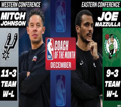 北京時(shí)間今日,NBA官方公布了12月最佳教練,馬刺主帥米奇-約翰遜和凱爾特人主帥喬-馬祖拉當(dāng)選。